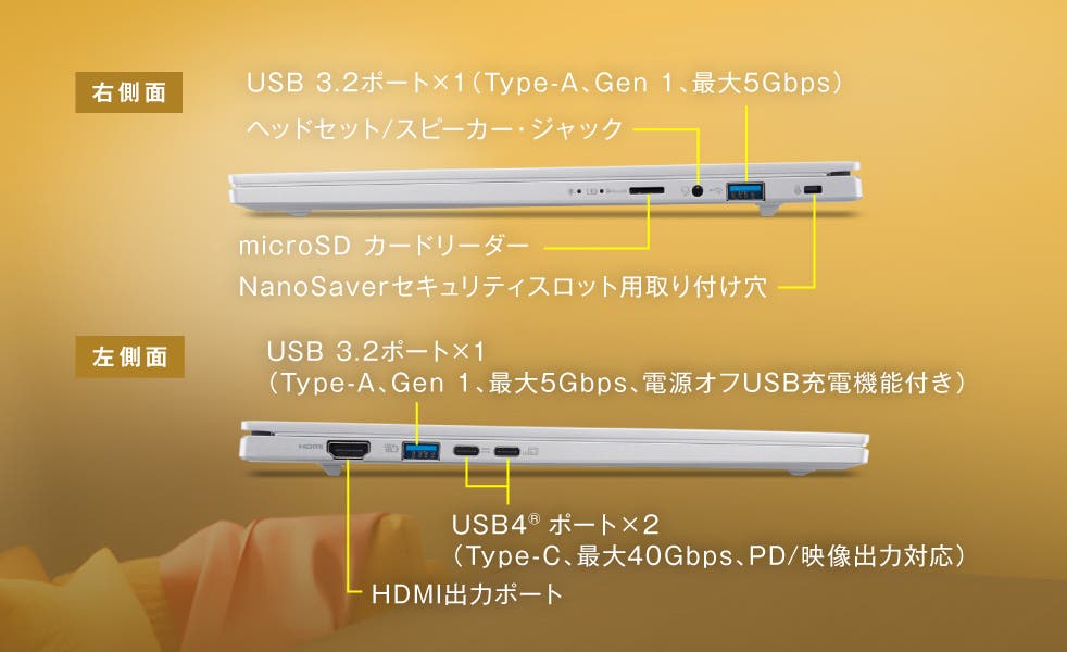 【外部インターフェース】USB4 ポート×2(Type-C、最大40Gbps、PD/映像出力対応)、USB 3.2ポート×1(Type-A、Gen 1、最大5Gbps、電源オフUSB充電機能付き)、USB 3.2ポート×1(Type-A、Gen 1、最大5Gbps)、ヘッドセット/スピーカー・ジャック×1、HDMI出力ポート×1
