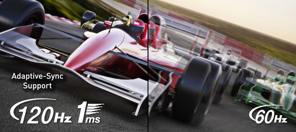 最大120Hz*1の高速リフレッシュレートで動画やゲームをさらになめらかに。ビジュアルレスポンスブースト(VRB)*2、1msという速い動画応答時間を叶えることで、動きの速い映像でもシャープに映し出します。またAdaptive-Sync*2によるティアリング(チラつき)抑止技術でぼやけ、カクつきを軽減し、よりなめらかで鮮明な映像を映し出します。