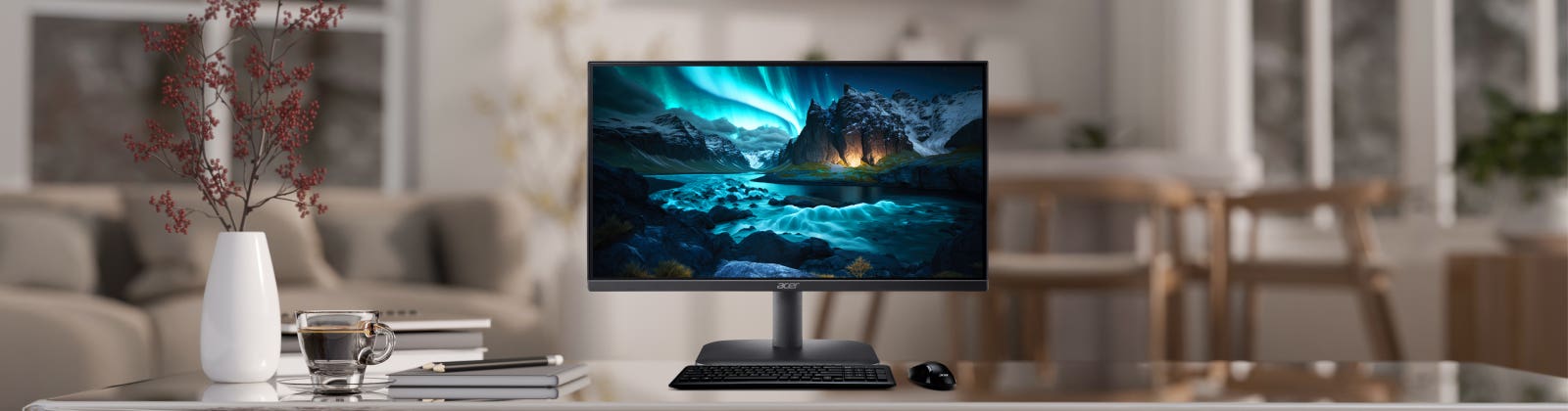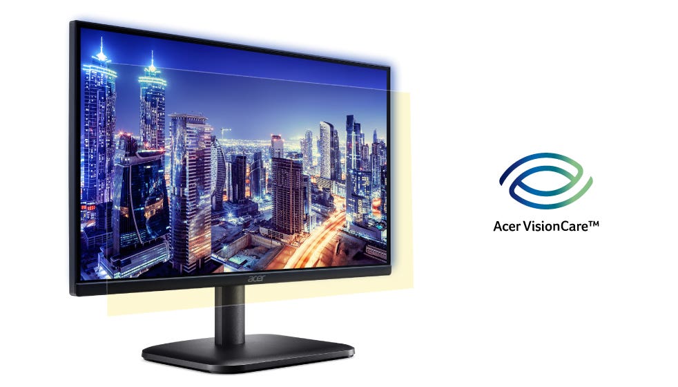 長く快適に使っていただけるよう、Acer VisionCare™技術を採用。画面のちらつきを抑えるフリッカーレス、暗い環境で明るさを調整するローディミング技術、眼精疲労の要因となるブルーライトを軽減するブルーライトシールド、パネル表面のざらつきや映り込み、外光反射を抑えるコンフィビューディスプレイなど、目へのやさしさに配慮した仕様です。