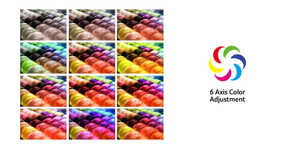 6軸カラー調整機能を搭載。プロのニーズに合わせ、色相や彩度の細かな調整をかなえます。RGBに加え、C(シアン)、M (マゼンタ)、Y (イエロー) までをカバーすることで、鮮明な色のパワーを引き出します。