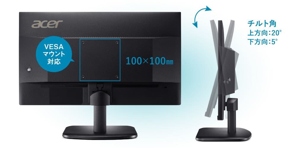 チルト角 上方向20°、下方向 5° の調整が可能。お好みの角度に調整していただけます。また、VESAマウント 100 x 100mm に対応しているので、モニターアーム*を使用することでさらに自由に、細かい調整が可能になります。