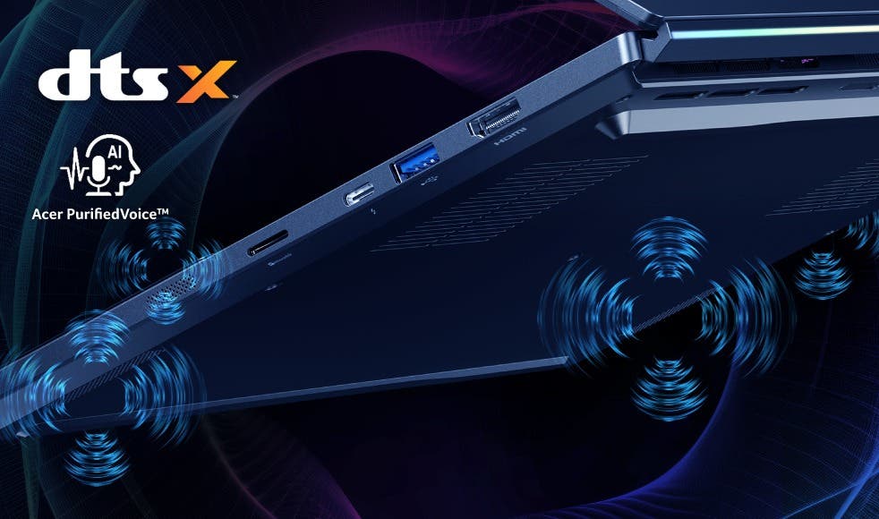DTS:X® UltraとAcer TrueHarmony™による立体音響、6基のスピーカーとHi-Res対応DACが繊細な音を描写。PurifiedVoice™ 2.0はAIノイズリダクションにより、自分と相手の周囲の雑音を除去し、双方向の音声をクリアに保ちます。最大600Ωの高インピーダンスヘッドホンにも対応し、音にこだわるクリエイターにも最適。またAcer PurifiedView™ 2.0が背景ぼかしや視線補正をリアルタイムで処理し、配信やビデオ通話もプロの仕上がりへ。