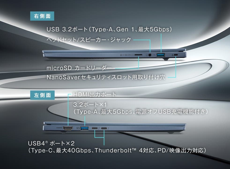 【外部インターフェース】USB4 ポート×2(Type-C、最大40Gbps、Thunderbolt 4対応、PD/映像出力対応)、USB 3.2ポート×1(Type-A、Gen 1、最大5Gbps、電源オフUSB充電機能付き)、USB 3.2ポート×1(Type-A、Gen 1、最大5Gbps)、ヘッドセット/スピーカー・ジャック×1、HDMI出力ポート×1