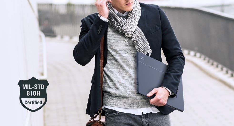 1.24Kgの軽量プレミアムデザインながら、米国軍用規格 MIL-STD 810H に準拠した設計を実現。日常の衝撃や環境変化にも安心の耐久性を持ち合わせています。ヒンジは20,000回の開閉試験に合格し、キーボードも1,000万回の押下試験をクリア。厳格な検証を経た堅牢性で、持ち運びに安心を与えます。