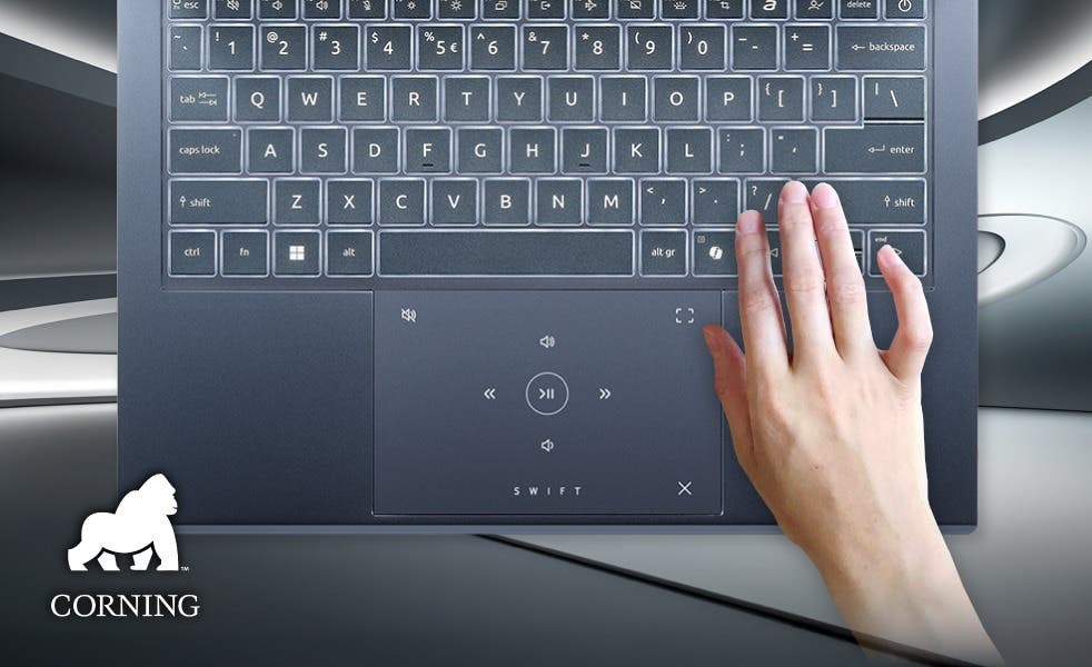 Corning Gorilla® Glass™ を採用したマルチコントロール・ライティング・タッチパッドを搭載。スワイプ操作ひとつでタッチパッドはメディアコントローラーへと変化。音量調整やワンクリックでのミュート、全画面表示の切り替え、さらに音楽や動画の再生/一時停止やトラック移動までスムーズに操作可能です。ノートPCに新たな操作体験をもたらす、スマートで快適なインターフェースです。