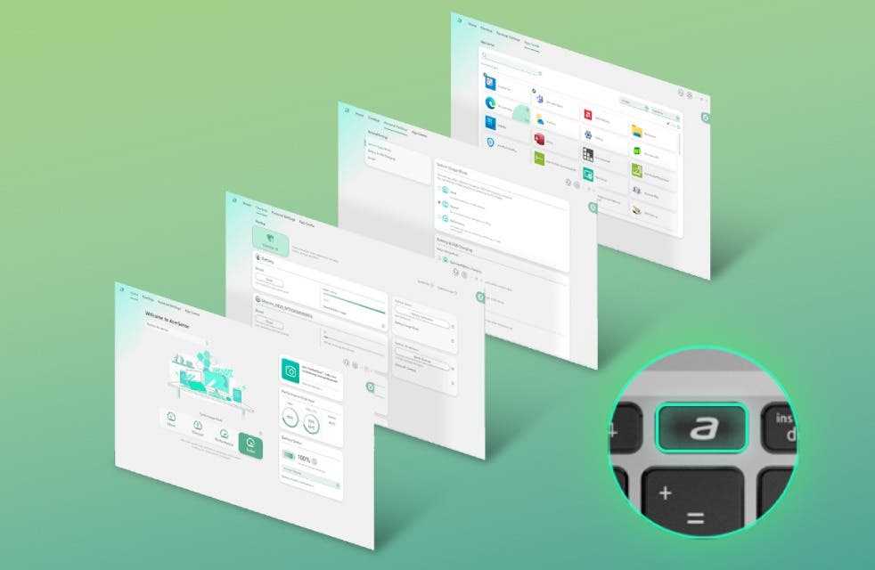 AcerSense ™は、Swift Goをより快適に使うためのユーティリティアプリ*。専用キーをクリックすれば、パフォーマンスの切り替えやバッテリー管理、システムの状態確認などがかんたんに行えます。「ホーム」では使用モードの変更と状態チェック、「エクスペリエンスゾーン」では便利なAI機能の紹介と管理。「チェックアップ」でPCの健康チェック、「個人設定」でPCをカスタマイズ、「アプリセンター」からはよく使うアプリへすぐにアクセスできます。