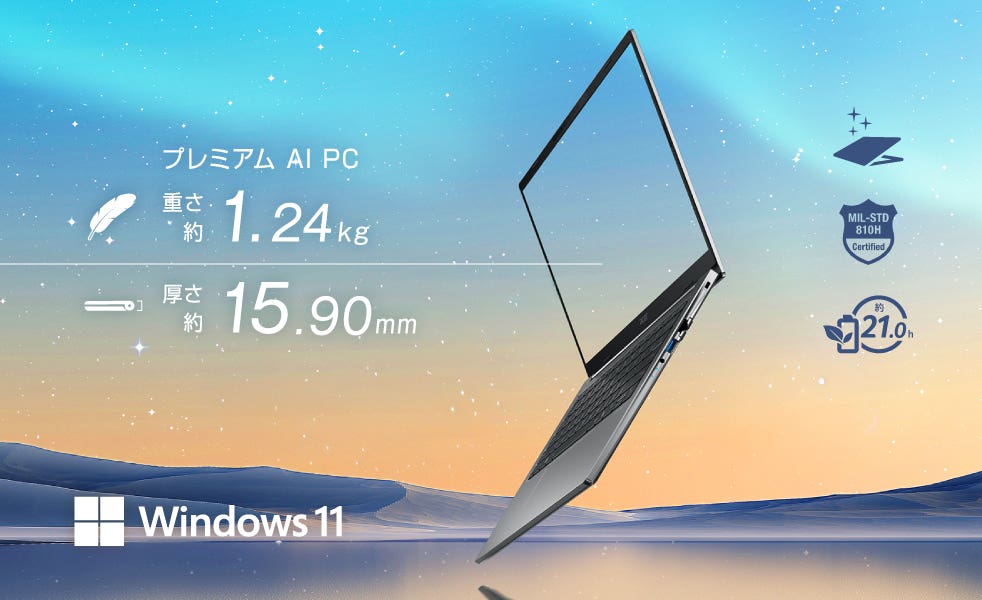 1.24Kgの軽量プレミアムデザインながら、米国軍用規格 MIL-STD 810H に準拠した設計を実現。日常の衝撃や環境変化にも安心の耐久性を持ち合わせています。ヒンジは20,000回の開閉試験に合格し、キーボードも1,000万回の押下試験をクリア。厳格な検証を経た堅牢性で、持ち運びに安心を与えます。