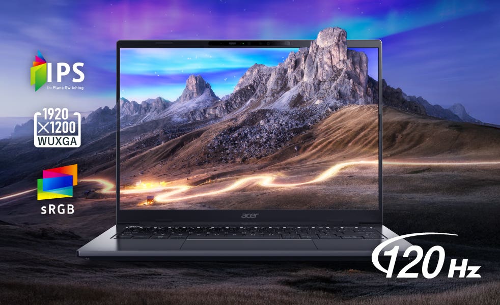 14インチ WUXGA(1920×1200)16:10 のIPSディスプレイは、作業にも映像鑑賞にも最適な広々とした表示領域を確保。色域 sRGB 100%対応により、写真や映像を色彩豊かに正確に再現します。また非光沢パネルにより映り込みを抑え、長時間の作業や学習でも快適な視認性をサポート。さらに120Hzのリフレッシュレートにより、チラつきが少なくなめらかな描写をかなえ、映画や動画はもちろんビジネス文書やクリエイティブワークでも表現力を発揮します。