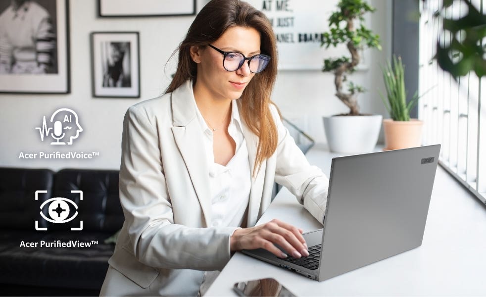 Acer AIビジョンセンサー内蔵で、顔の向きや距離を検知して操作をアシスト。マルチスクリーンアシスト機能では、視線を向けるだけでカーソルやウィンドウが瞬時に移動し、複数ディスプレイでの作業がシームレスに。さらに、ユーザー検知機能により離席時は自動ロック、復帰時はWindows Hello顔認証でスムーズに再ログインします。また、スマートリマインダーが定期的な休憩やPCとの適切な距離をやさしく知らせ、目の疲れを軽減。画面から目を離すと明るさを自動的に落としてくれます。安全性・快適性をAIが一歩先に支える、次世代のスマート機能です。