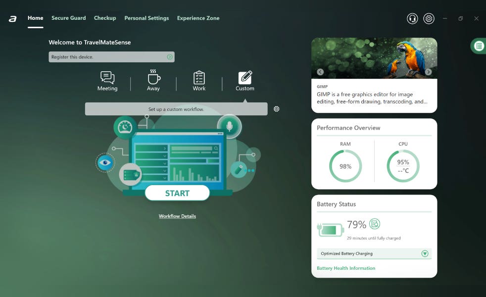 TravelMateSense™ は、ビジネスを快適かつ効率的にサポートするユーティリティアプリ*。専用キーをクリックするだけで、パフォーマンスの切り替えやバッテリー管理、システムの状態確認などを直感的に操作できます。「ホーム」では使用モードの変更や状態チェックが可能、「エクスペリエンスゾーン」では便利なAI機能をまとめて管理。「チェックアップ」でPCの健康状態を確認し、「個人設定」で自分好みのカスタマイズを行えます。「アプリセンター」からは、よく使うアプリにすぐアクセスできます。