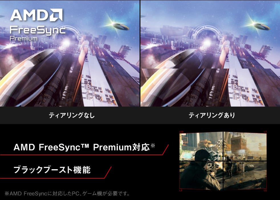GPUとディスプレイによる描写のティアリング(カクつき)を軽減するAMD FreeSync™ Premium対応*で、高速プレイもお任せ!さらにブラックブースト機能で黒の強弱を調節して暗がりの視認性を高めます。普段なら見つけにくい、暗がりにいる敵もいち早く狙撃可能!