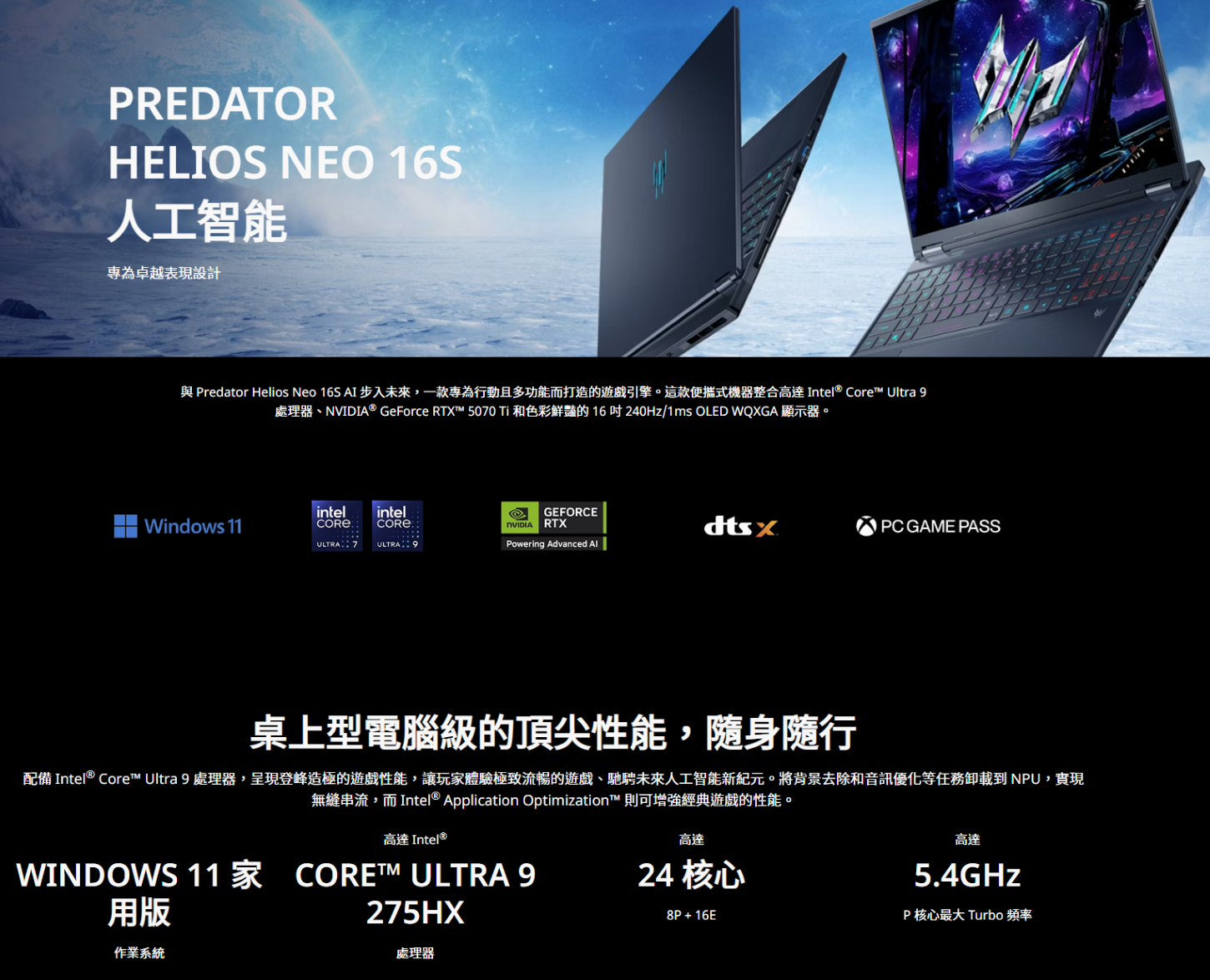 Predator Helios Neo 16S AI | PHN16S-71-71VB | RTX 5060 | Windows 11 Home | Ultra 7 255HX | 16" WQXGA 240Hz OLED | 16GB | 1TB SSD | 電競手提電腦
