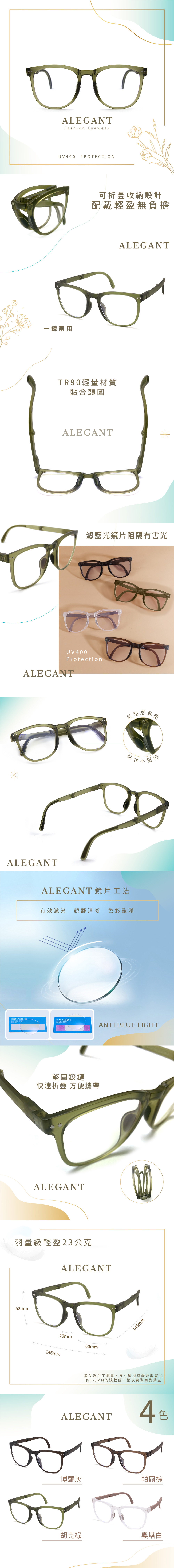 【ALEGANT】樂讀時尚多功能胡克綠TR90輕盈氣墊感折疊款方框UV400濾藍光眼鏡