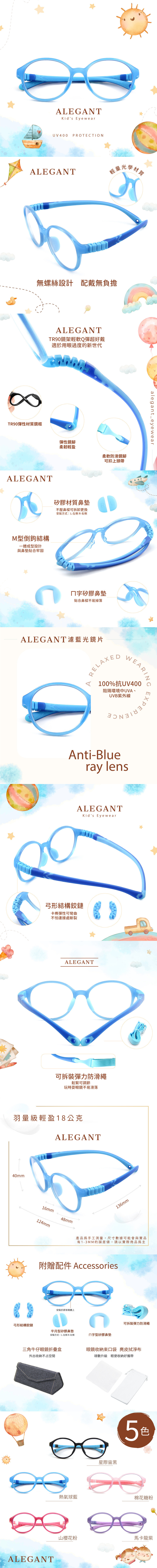 【ALEGANT】熱氣球藍無螺絲設計輕量柔韌彈性圓框UV400兒童光學濾藍光眼鏡(附可拆裝防滑眼鏡繩)