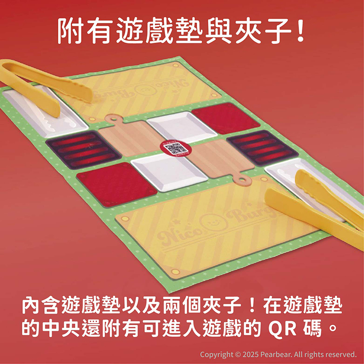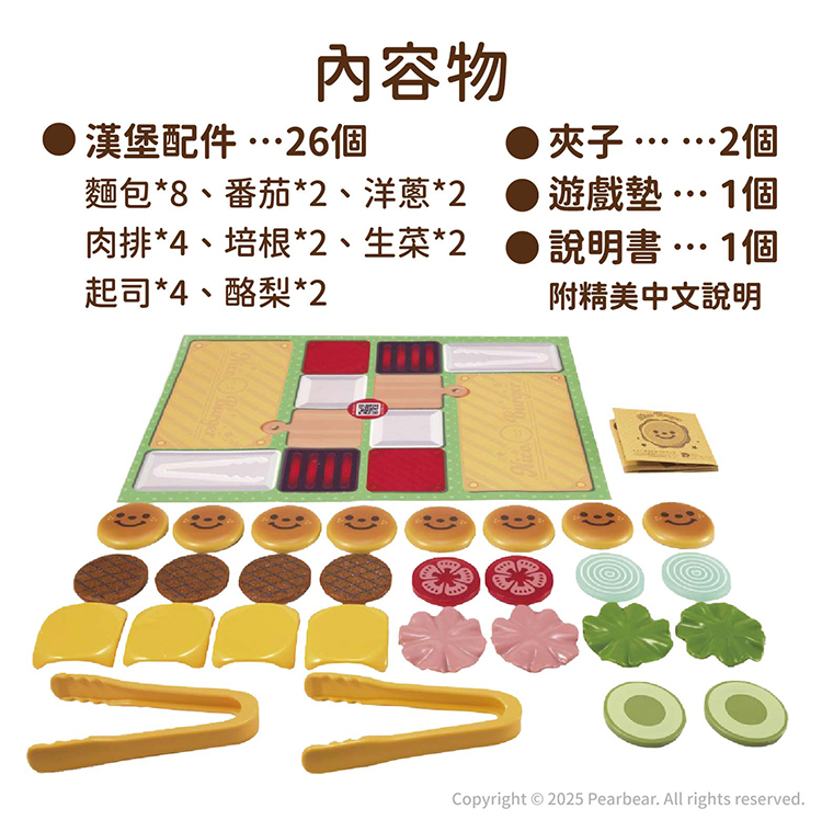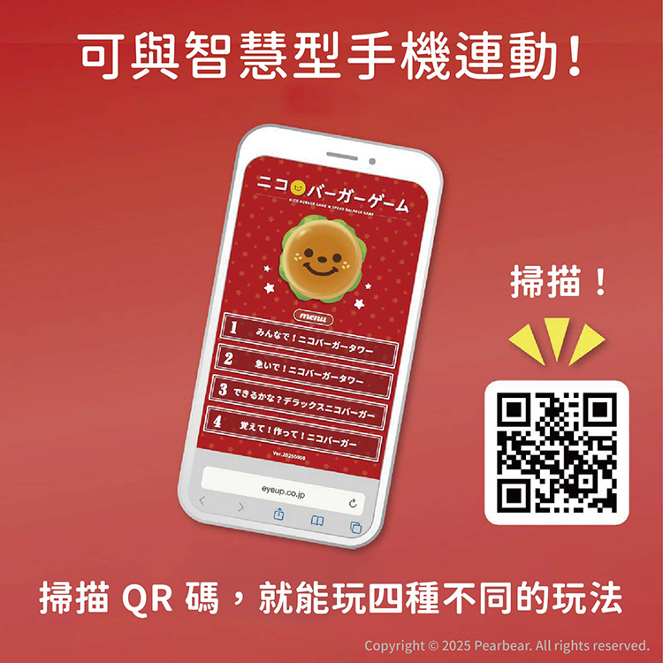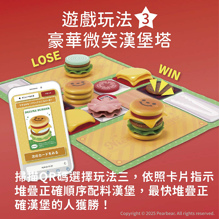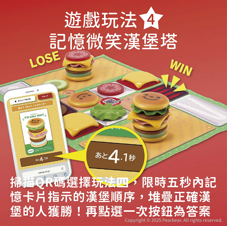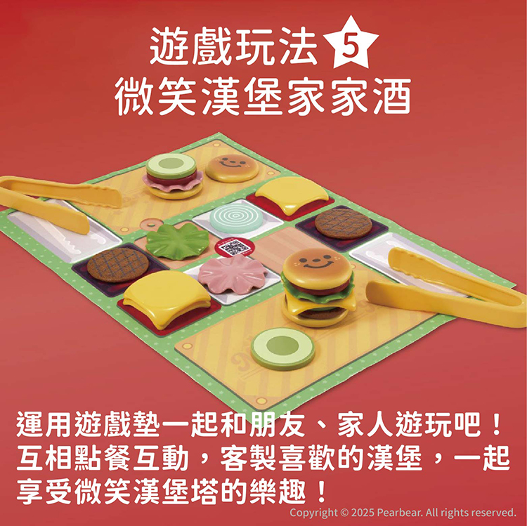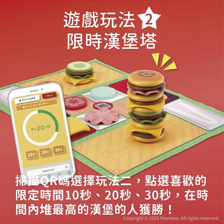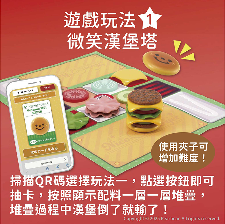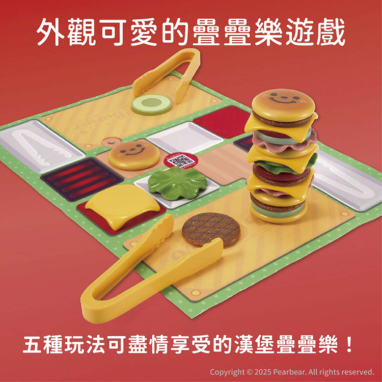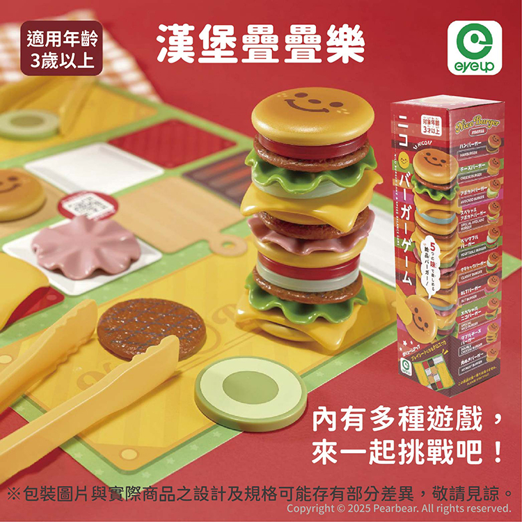 EYEUP是日本專門以設計可愛以及紓壓玩具的品牌,所創作的可愛商品都擁有許多各式不同的玩法及趣味性。漢堡疊疊樂是一款適合親子或派對同樂的漢堡疊疊樂積木遊戲。玩家可以透過掃描QR碼連動遊玩多種玩法,也可以用遊戲墊與工具來模擬開漢堡店、製作創意漢堡。遊戲內含漢堡配件*26、夾子*2、遊戲墊*1、說明書*1。有五種不同的遊戲模式,從堆高塔、限時挑戰、記憶遊戲、依指示製作到角色扮演漢堡店都有。遊戲墊採用布質不易撕裂,加上夾子使用能提升遊戲難度與趣味性。除了產品的內容豐富,搭配許多可愛的配件。多種緊張刺激的遊戲組合,適合全家大小一起挑戰。