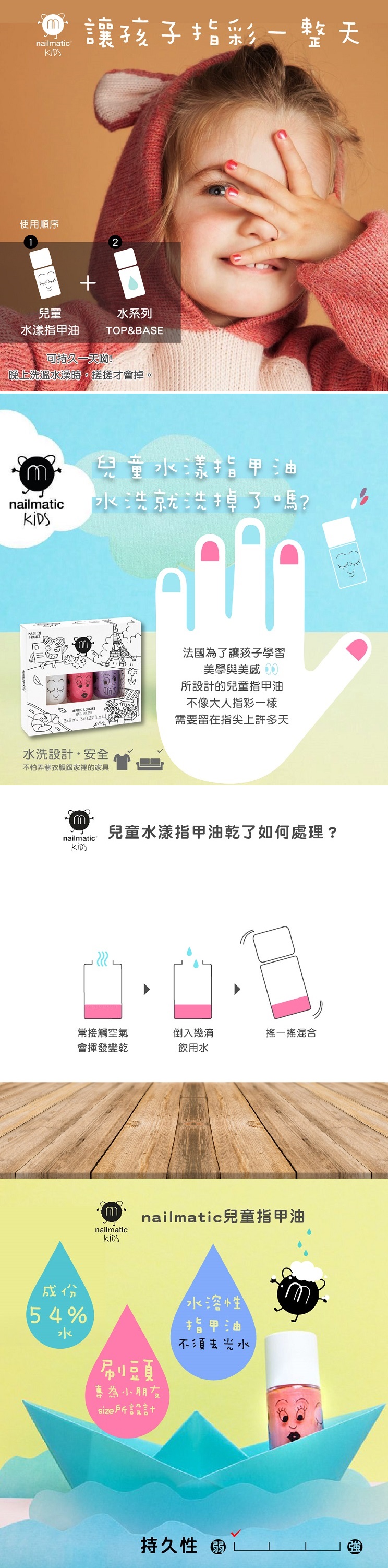 「美麗人生因為色彩而更有樂趣」,nailmatic的品牌故事訴說著這樣的概念,它來自法國巴黎,原本是專業指甲油品牌,自2014推出nailmatic Kids 小朋友專屬的水漾亮彩指甲油,繽紛的色彩與多樣的選擇。除了小朋友之外,強調無毒與可水洗的產品設計,連孕婦也適用,讓寶貝徜徉在多彩多姿的世界,因為有nailmatic而更有趣