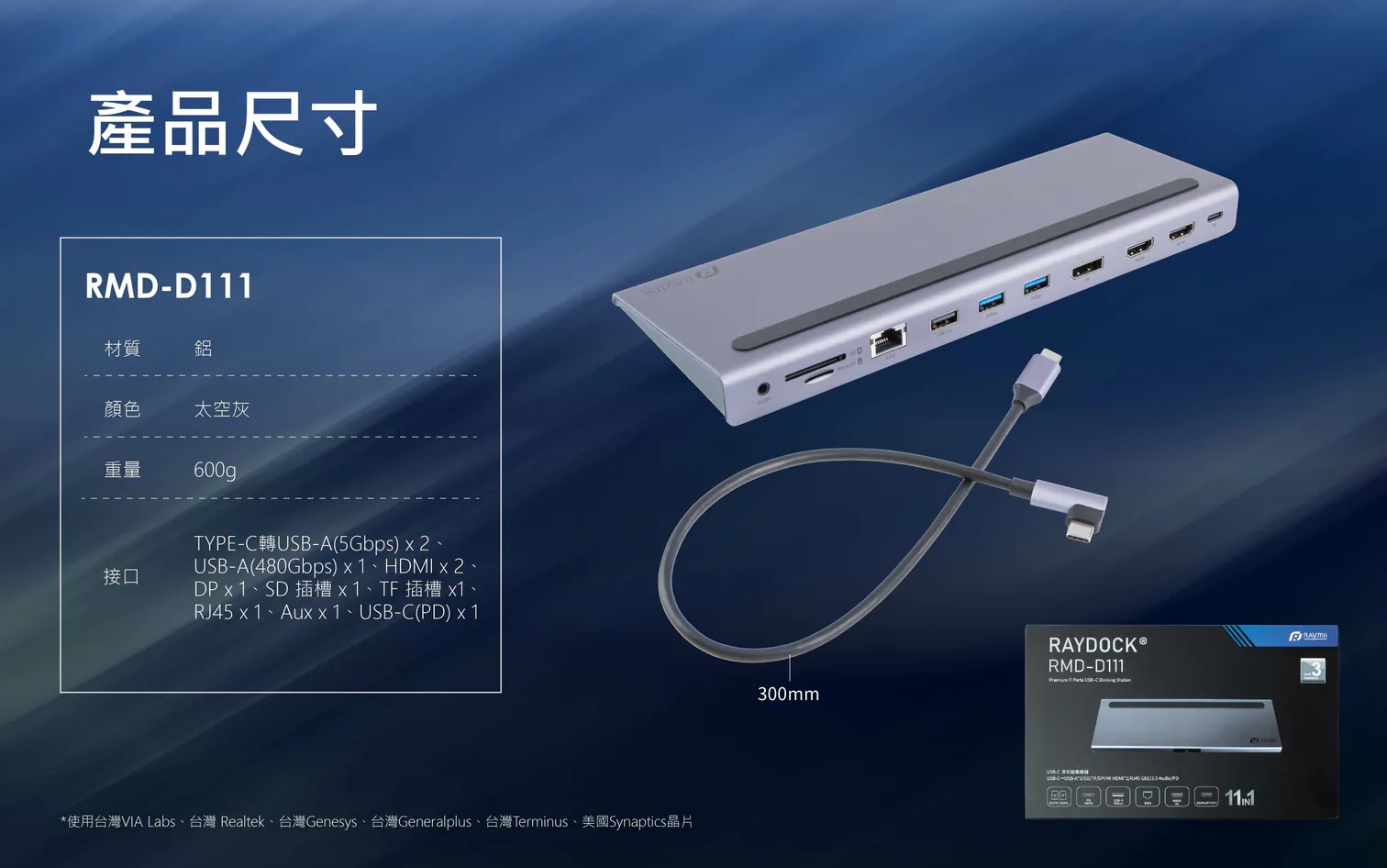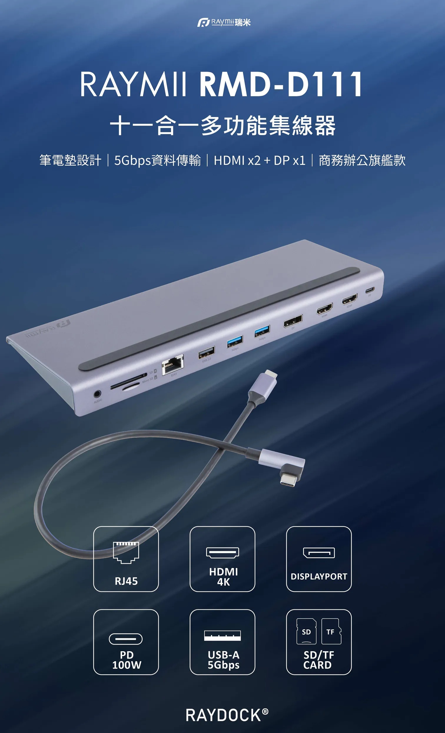 【瑞米 Raymii RAYDOCK® RMD-D111 三屏顯示Docking Station HUB USB-C 11合一集線器 HDMI DP 4K60Hz 100W快充 RJ45 讀卡機】