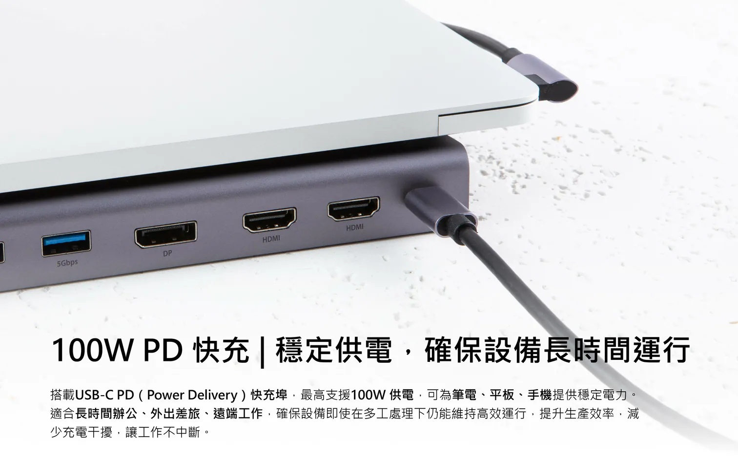 6. 支援USB-C 100W PD3.0最大功率為主設備快速充電,是智慧型手機、筆記型電腦、平板電腦,和USB-C設備裝置的最佳充電支援