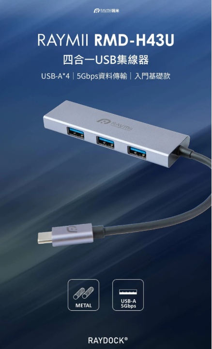【瑞米 Raymii RAYDOCK® RMD-H43U USB-C四合一集線器 5Gbps】