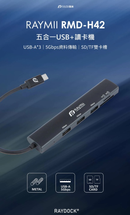 您正在評論: Raymii RAYDOCK® RMD-H42 USB-C五合一集線器 5Gbps 讀卡機