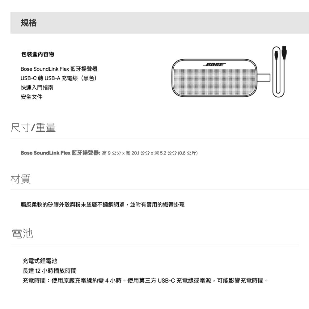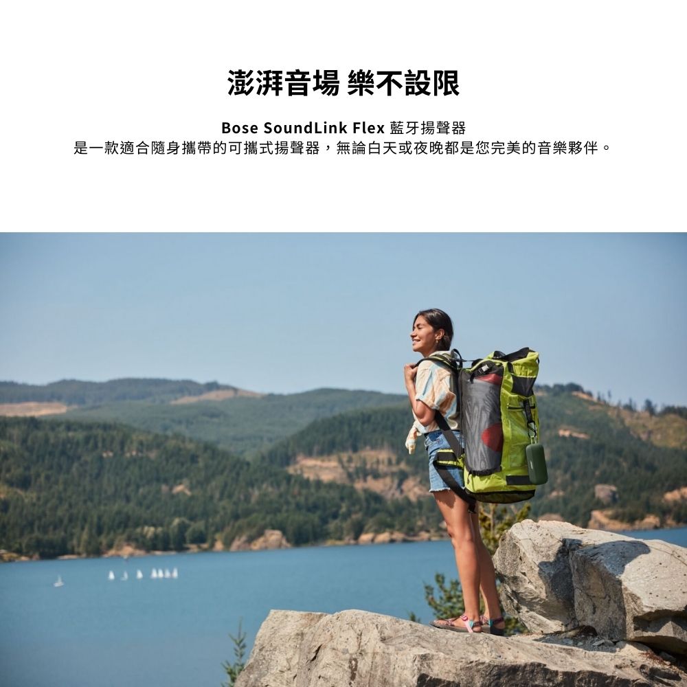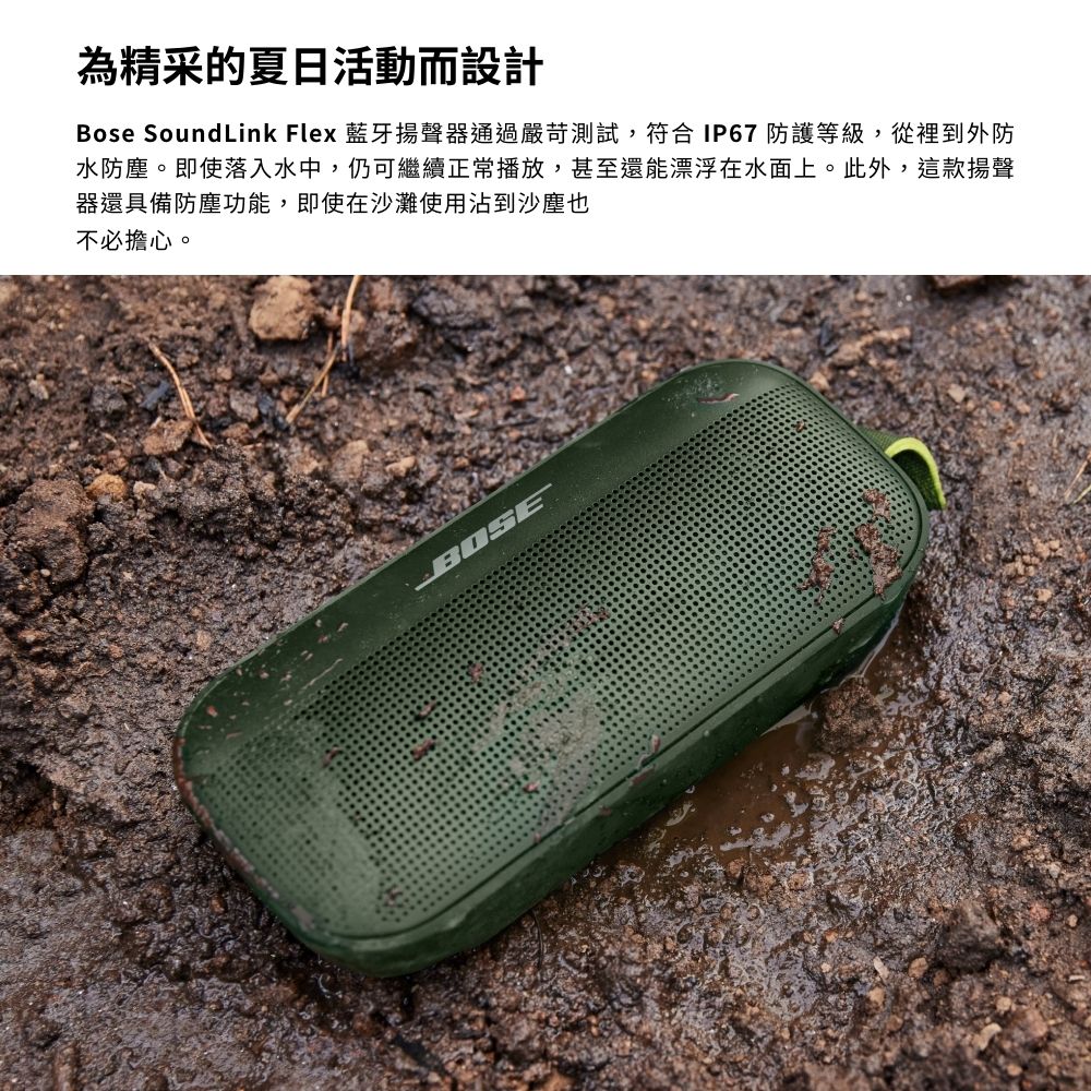 - 適合旅行的防水無線喇叭 : SoundLink Flex 經過嚴格測試,符合 IP67 防水喇叭標準。它採用防水材料製作和密封,甚至可以漂浮 - 非常適合戶外探險。