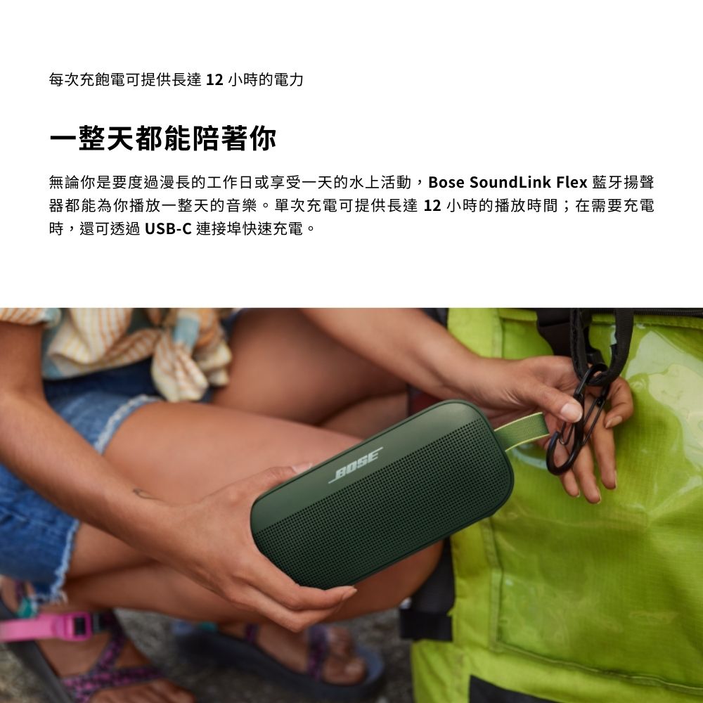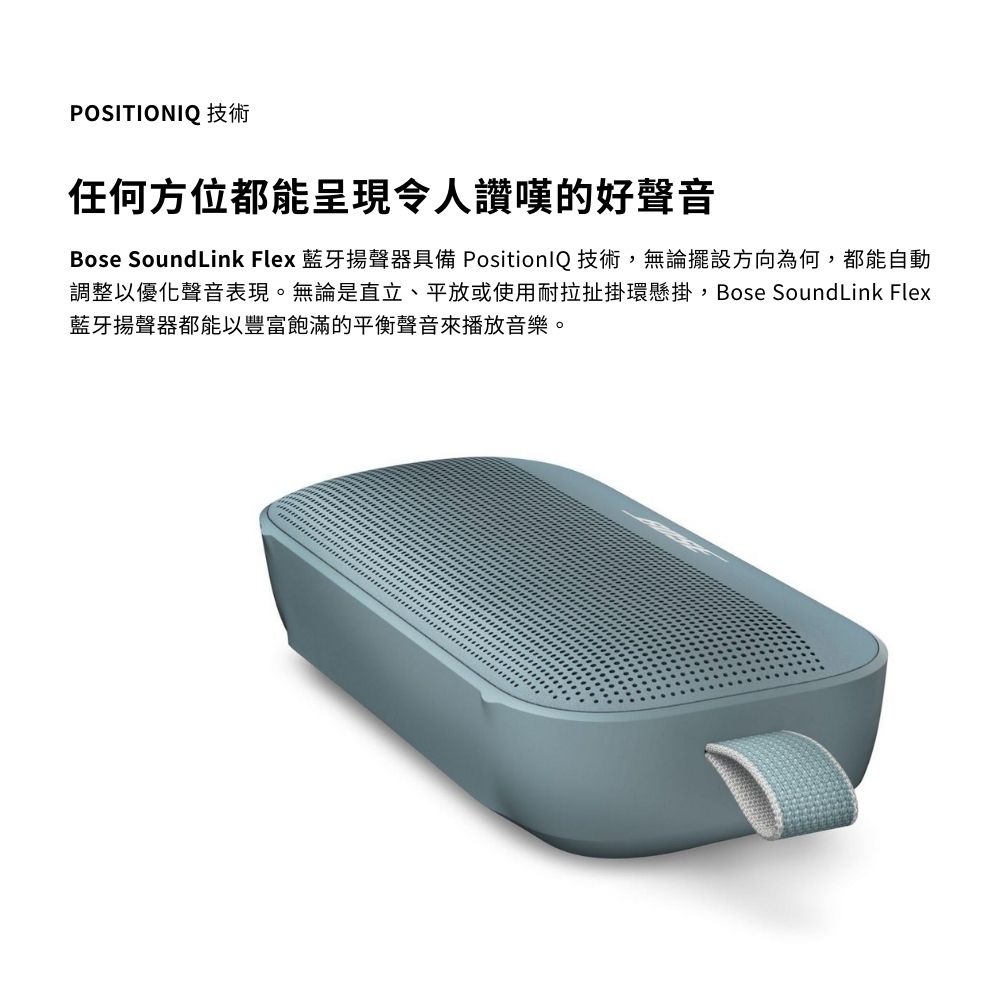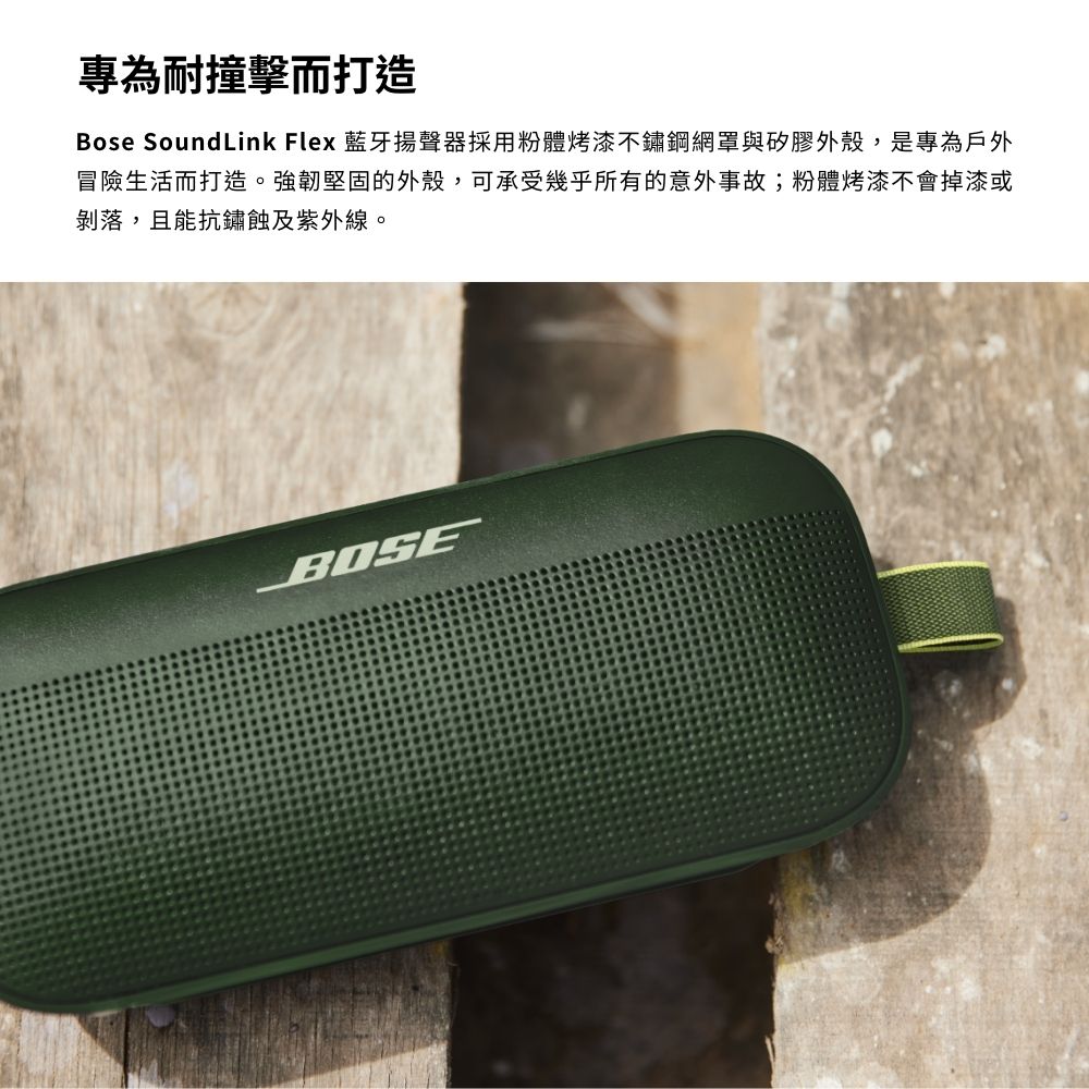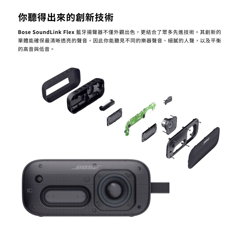 - 最先進的設計 : SoundLink Flex 戶外喇叭採用獨家技術和定制設計的換能器,可在家中或旅途中提供深沉、清晰和身臨其境的音質。