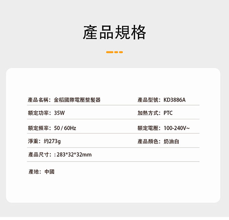 【金稻】 國際電壓整髮器 KD3886A(白)
