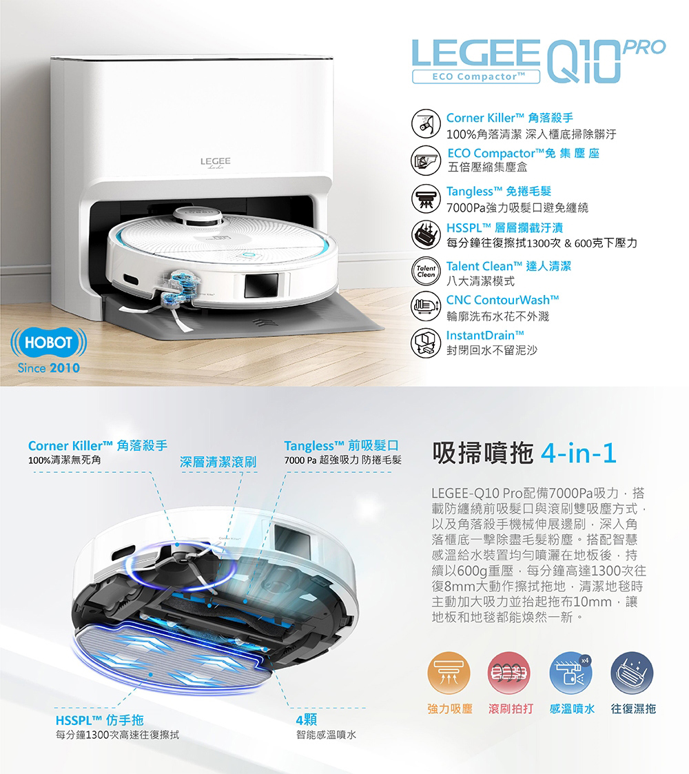 - LEGEE-Q10 Pro配備7000Pa吸力,搭載防纏繞前吸髮口與滾刷雙吸塵方式,