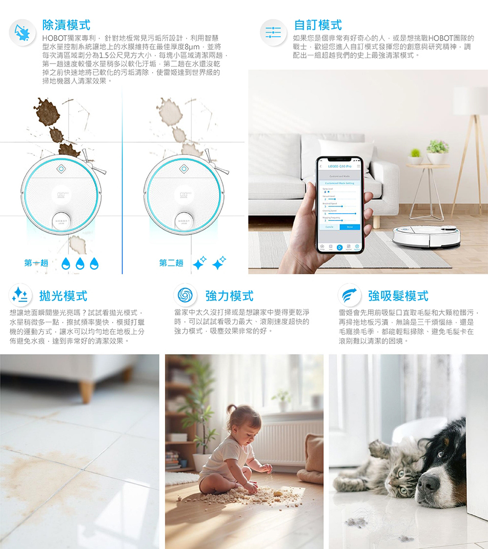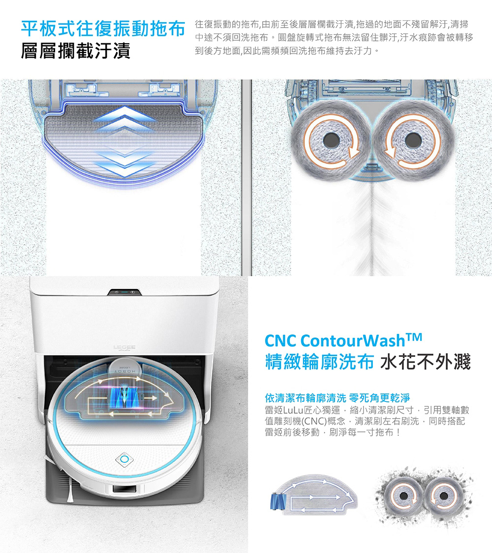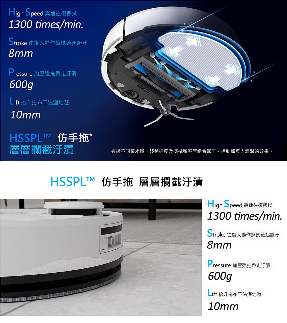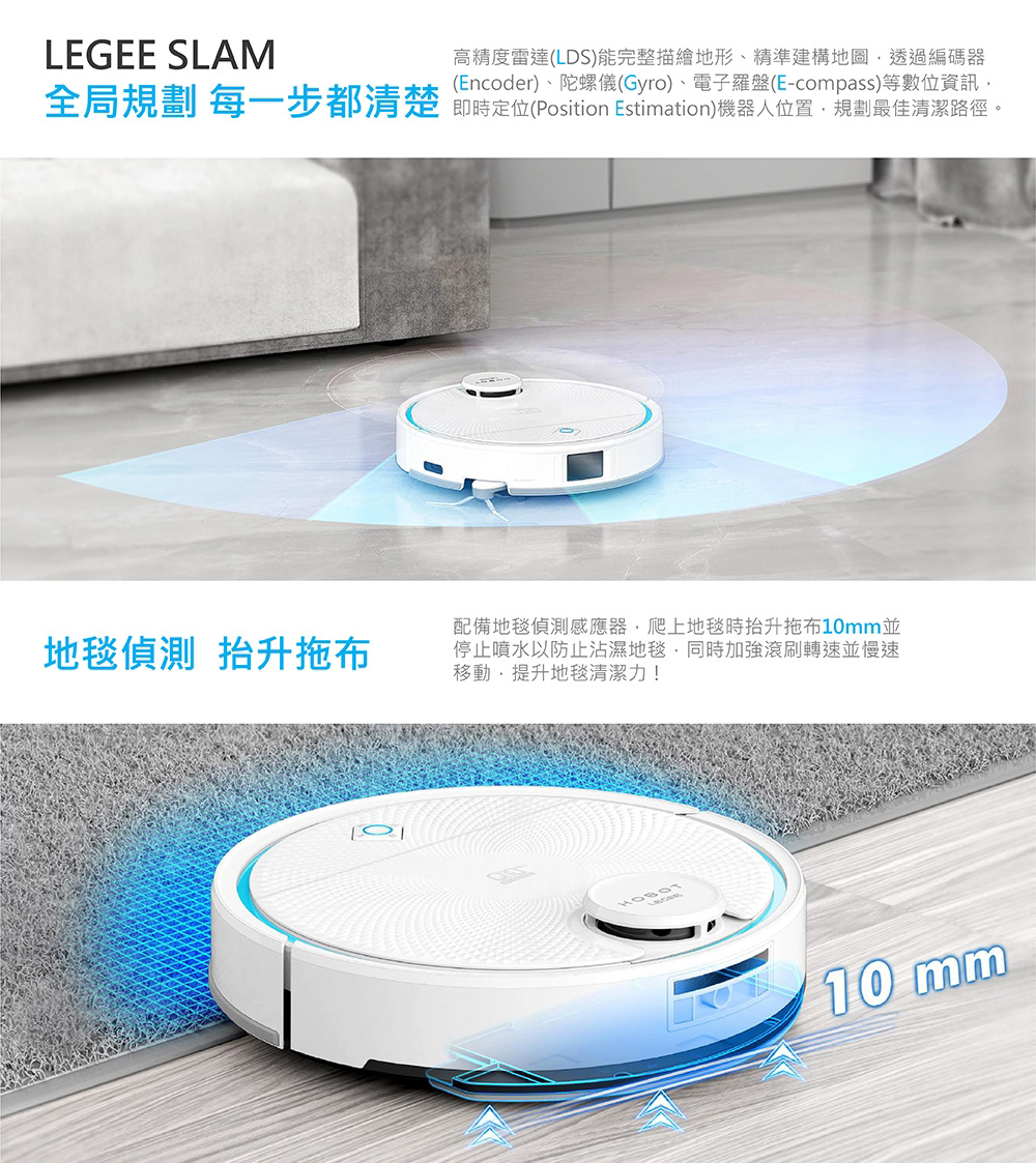- 復8mm大動作擦拭拖地,清潔地毯時主動加大吸力並抬起拖布10mm,讓