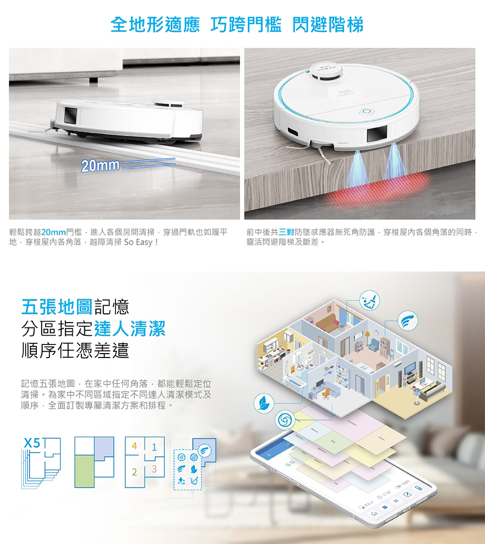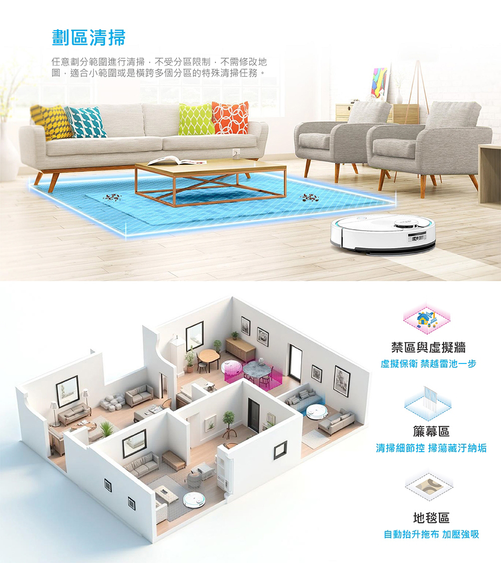 智慧空間與地圖細節規畫:5層地圖記憶/自動分區/虛擬牆/禁區/簾幕區/地毯區