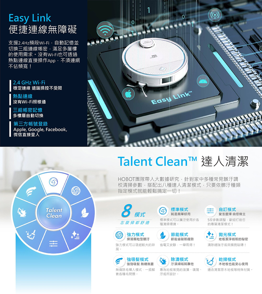 帳號登錄方式:HOBOT帳號/Facebook, Apple, Google, WeChat