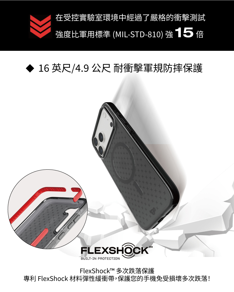☆英國銷售第一品牌☆Apple 官方指定合作配件品牌 ●全球專利 FlexShock 吸震材料,能夠有效吸收衝擊力保護機身 ●通過軍規防摔認證MIL-STD-810H,提供 16 英尺/4.9 公尺的防撞保護 ●採用標誌性經典菱格紋圖案 ●邊緣加高設計保護螢幕及鏡頭安全 ●支援MagSafe磁吸無線快充