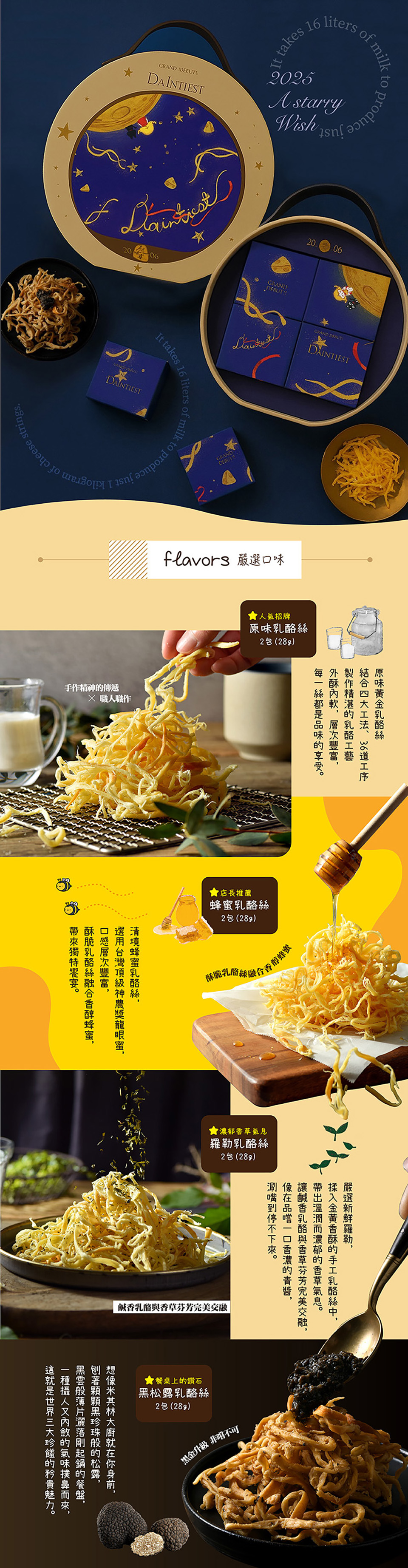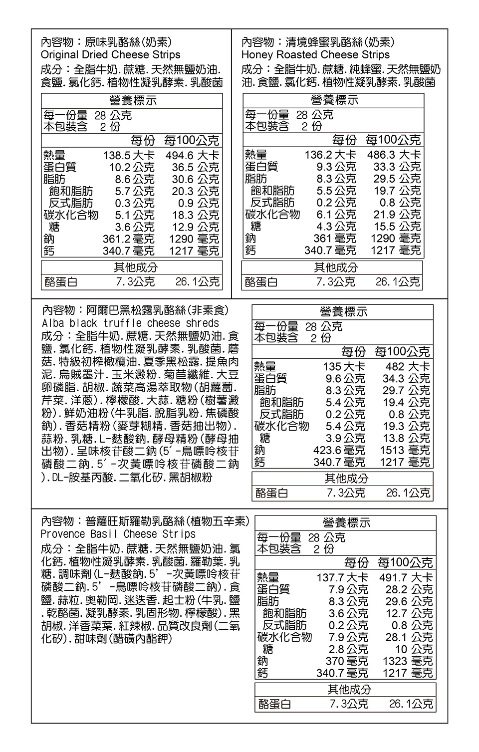 內 容 物|原味乳酪絲(奶素)28g *2、蜂蜜乳酪絲(奶素)28g *2、羅勒乳酪絲(植物五辛素)28g *2、松露乳酪絲(非素)28g *2
