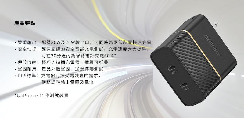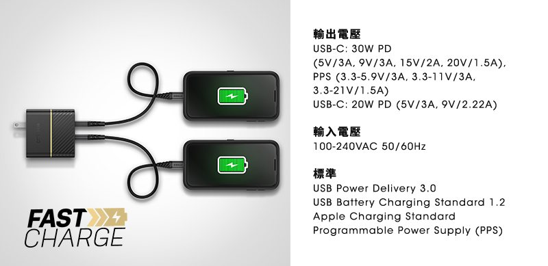 ☆美國暢銷品牌OtterBox☆快充耐用三年保固●支援AC 100V-240V國際通用電壓●90度可收折式插腳設計,兼顧攜帶收納●支援Power Delivery 3.0快速充電技術●雙孔Type-C輸出同時為兩個裝置充電●採用3.0 Amp高速輸出充電●支援PPS協定(Programmable Power Supply)●獨家三年保固